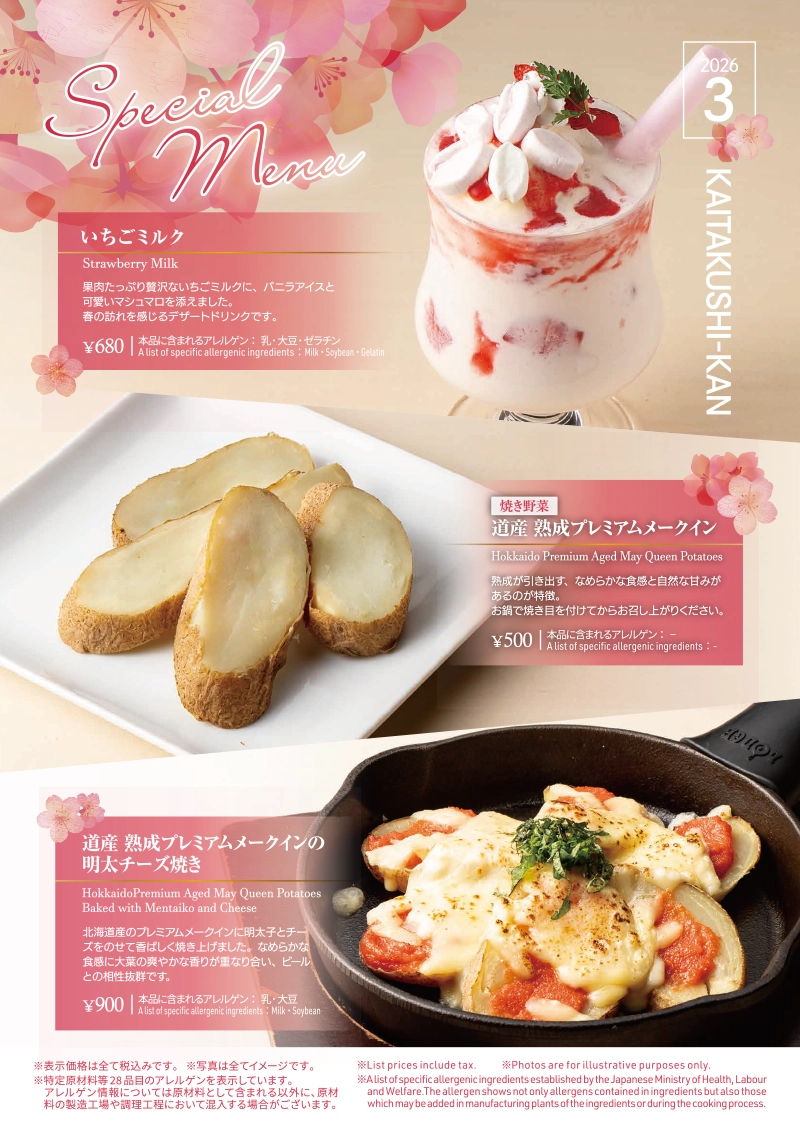 なめらかな食感と甘みが特徴の「熟成プレミアムメークイン」を香ばしく焼き上げた一皿や、春の訪れを感じる贅沢な「いちごミルク」などをお楽しみいただけます。